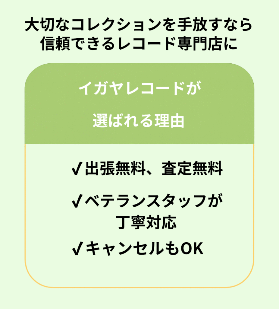 家のリフォーム等でレコード,CD.ミュージックテープ数箱を下取りに出しました。一枚一枚よく見るとの事で大量の枚数の為1週間程かかり査定結果がメールできました。非常に満足のいく内容でした。持ち込み来店時もとても感じの良く、店内も乱雑になって無い整理されてる印象でした。レコード等の買取は以前から数社利用していますが早くこちらを知っとけば良かったと思いました。
